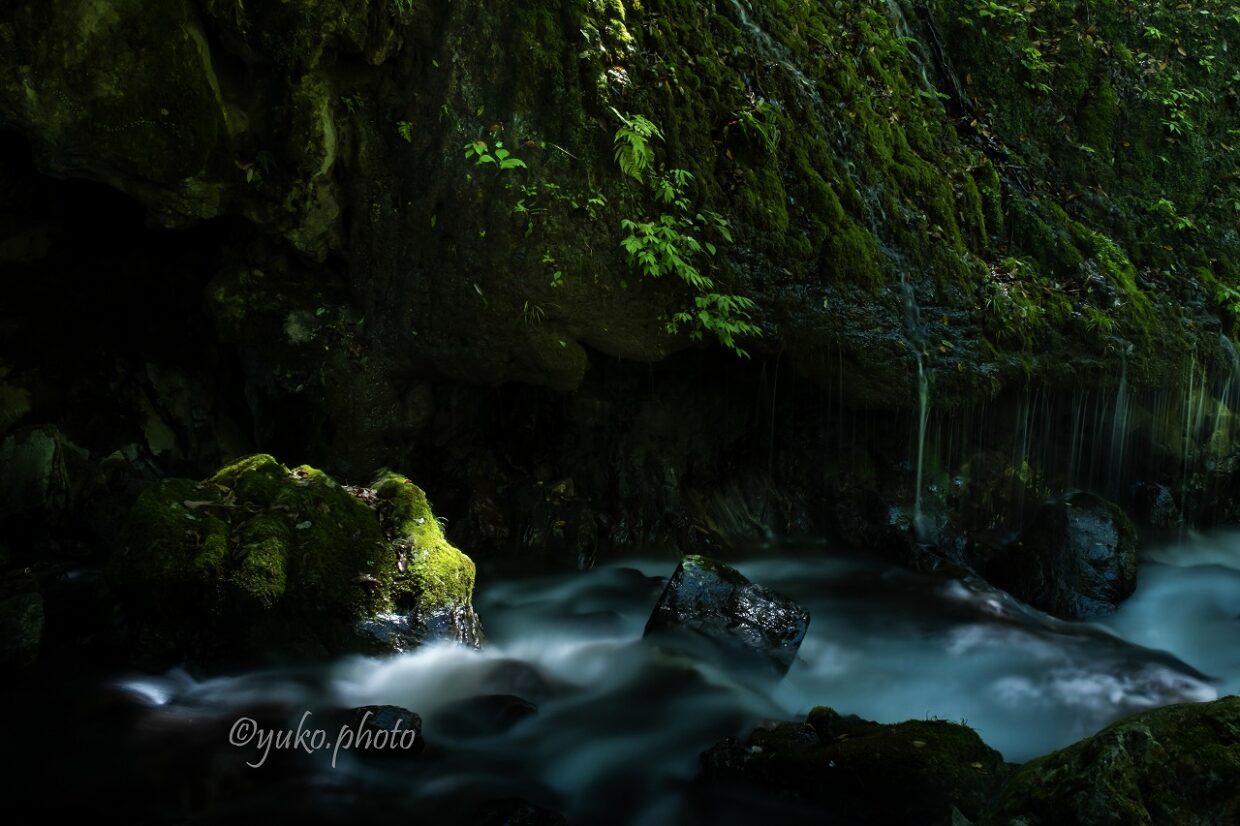 川の流れの音、しずかに岩から流れ落ちる水の音