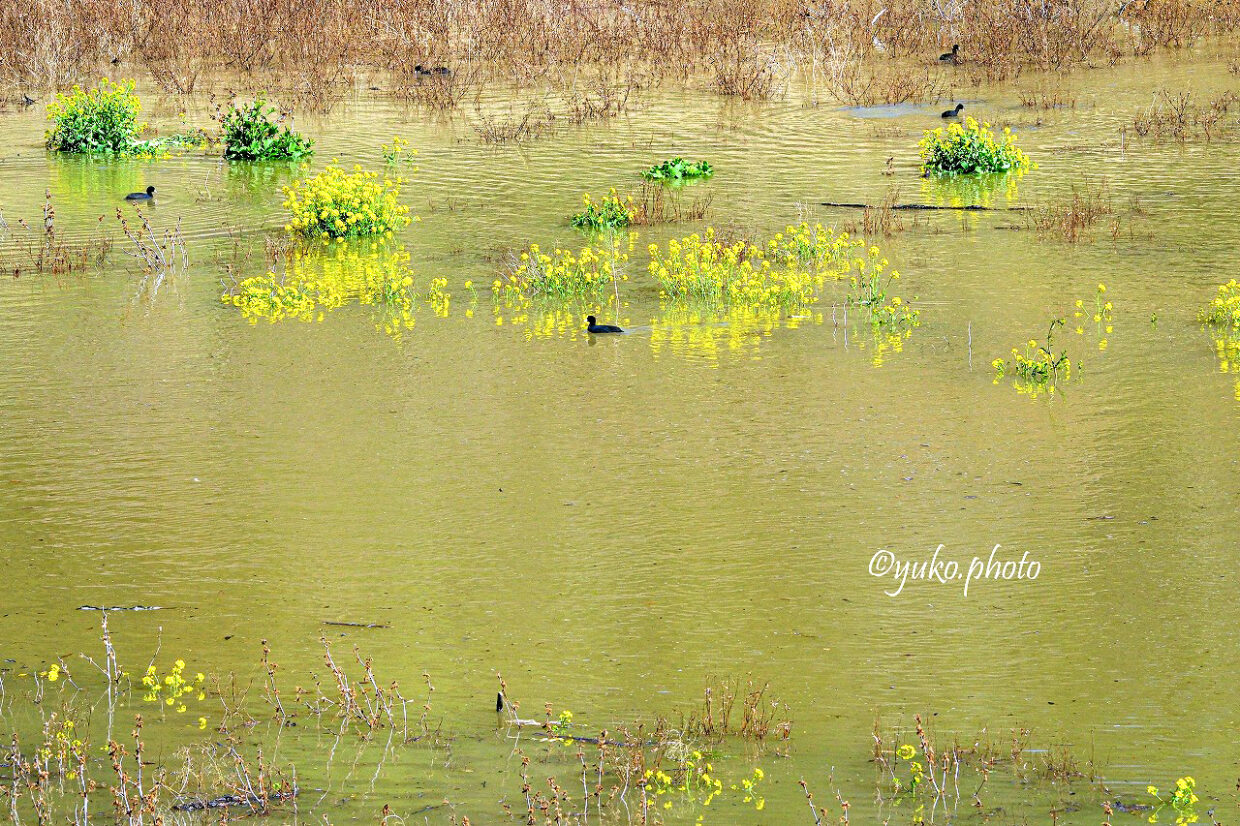 映り込んだ菜の花の間を カモたちが楽しそうに泳いでいる