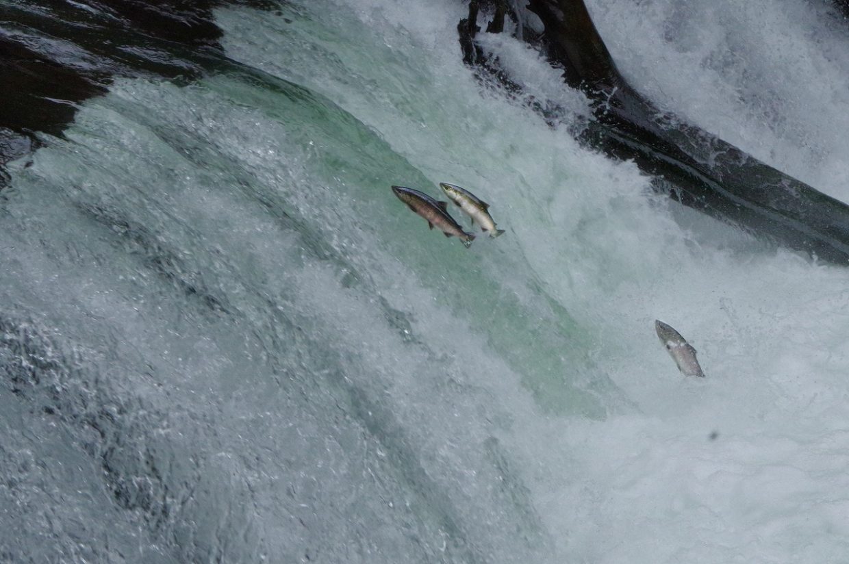 産卵のため滝をのぼるマス Trout climbing a waterfall for spawning
