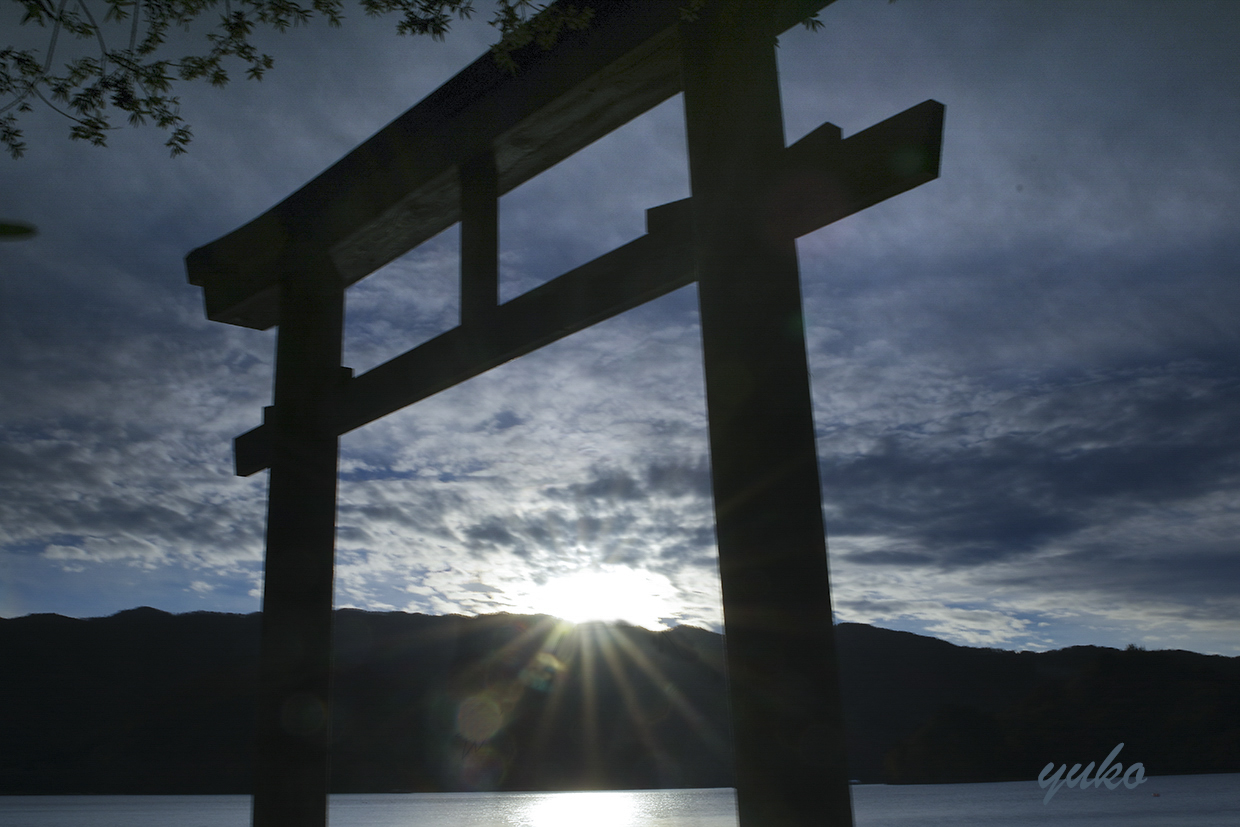 鳥居の間から太陽が顔をだした。